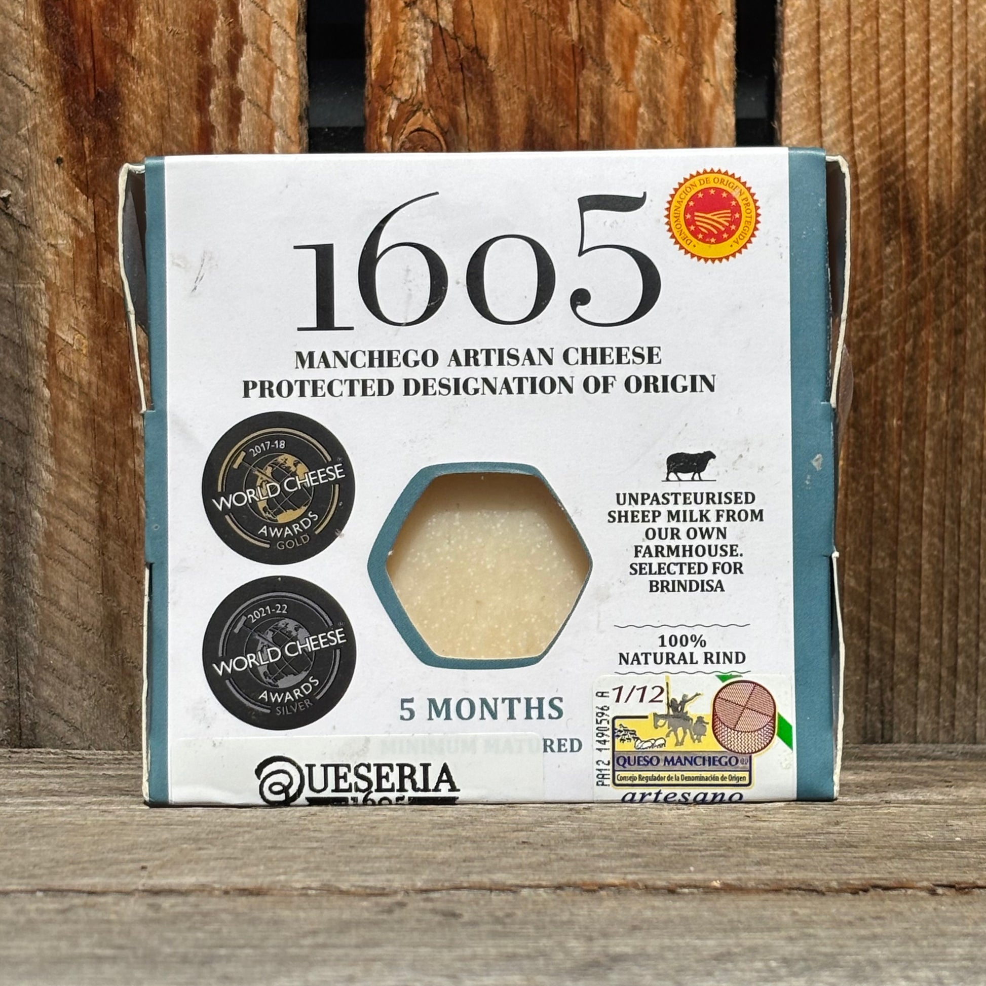 Masterful Manchego. As good as it gets. The 1605 Manchego is made at the Sierra la Solana estate, an area of about 350 hectares, which includes vineyards, almond plantations and olive groves, 150km south of Madrid. Here you can find a traditional rustic Mediterranean vegetation as well as a harsh and extreme climatic environment, ideal for the native Manchega sheep to roam about. The result is clean, rich-tasting milk with a sweet and malted cereal finish which translate into an elegant, fruity, intense flavours with a long finish. The aroma of this minimum 5-month-matured Manchego is of butter and cereal. The paste is pale ivory, semi-hard and dense; the flavours are of sweet and rich sheep’s milk and raw almonds. It has a long, clean finish. 230g.