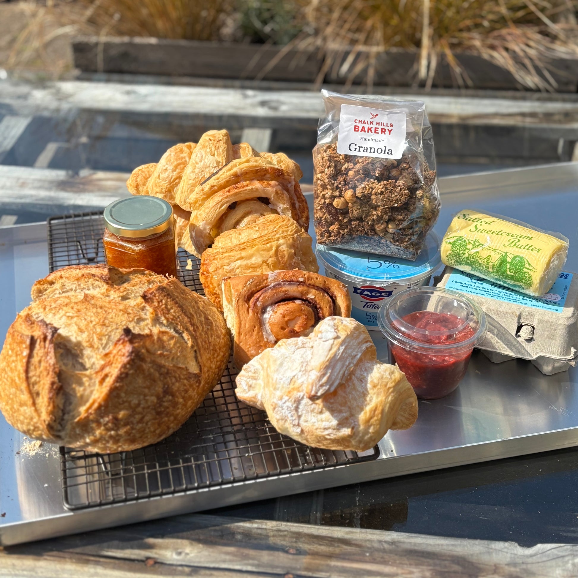 A fine Chalk Hills Brunch to feed four to six people. One large sourdough, six pastries (two butter croissants, pain au chocolat, pain aux raisins, almond croissant and cinnamon bun), Chalk Hills granola, a pot of our compote, a tub of Greek yogurt, Debbie's Seville Marmalade, salted farmhouse butter and six of Simon's free range eggs.