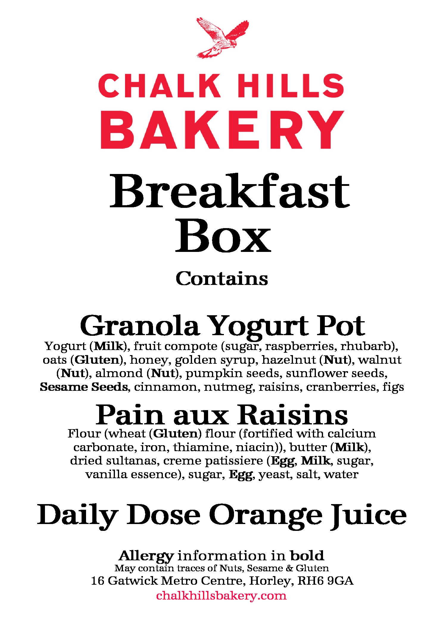 Pain aux Raisin, granola pot (Greek yogurt, our own Chalk Hills Bakery granola and compote), orange juice.