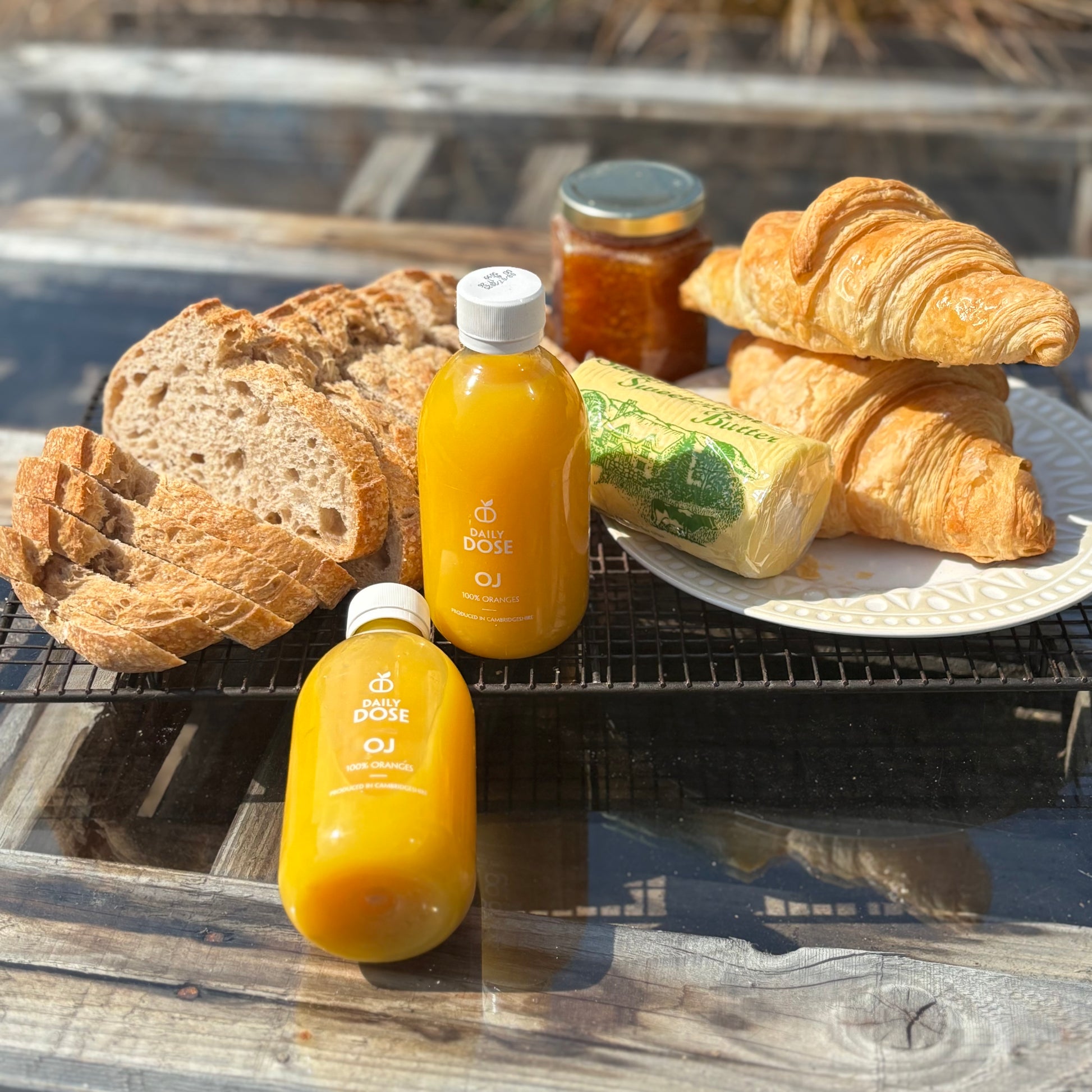 Breakfast in bed for two. Includes one small Sourdough, two butter croissants, two Daily Dose Orange Juices, a pack of salted farmhouse butter and a jar of Debbie's Seville Marmalade.