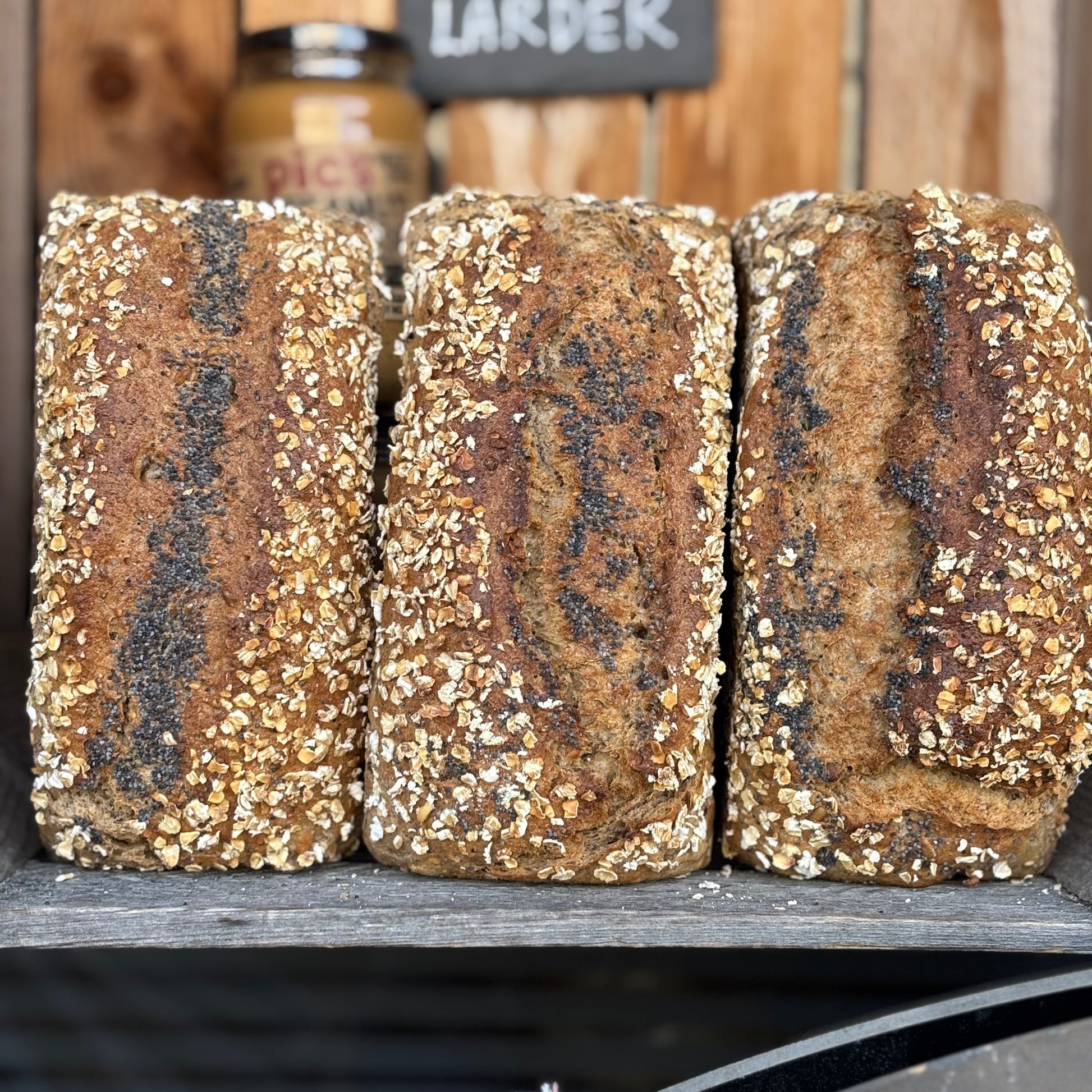 A wholemeal seeded loaf with a light texture and a seeded crust. 600g.