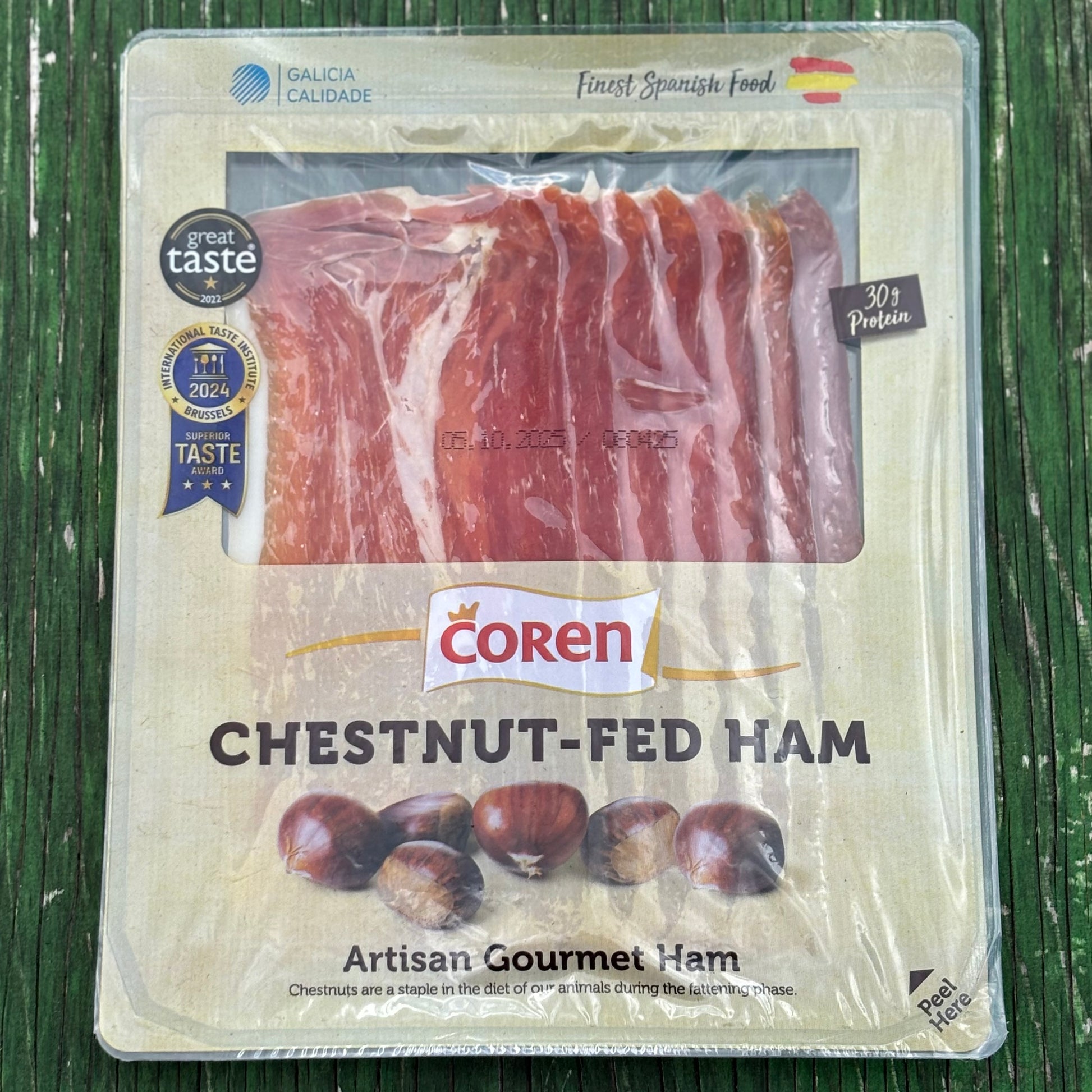 Coren is a cooperative based in Galicia, north-western Spain, and has been producing its Selecta range since 2012. The ham is cured in the traditional way but the pigs feed on chestnuts, giving the ham a slightly sweeter flavour. 100g.