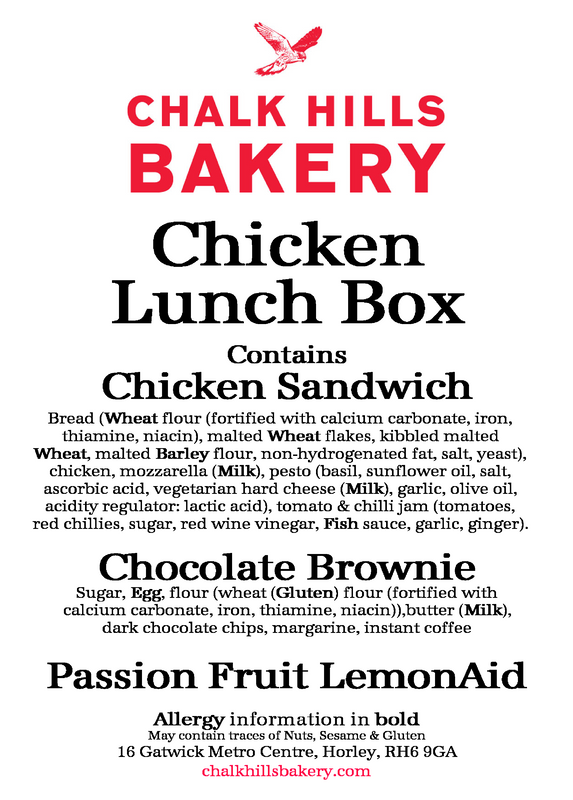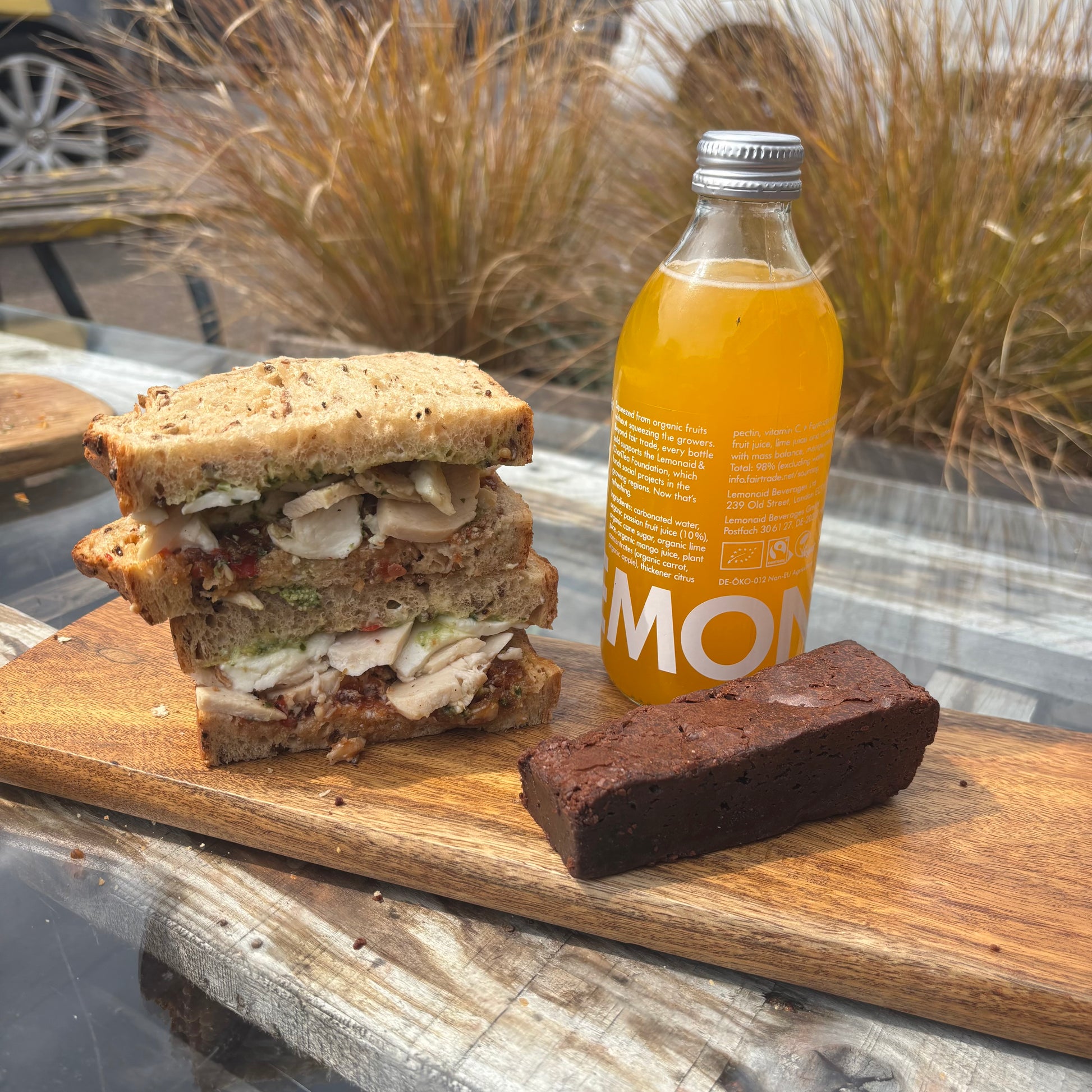 Lunch box with chicken sandwich (chicken breast, mozzarella, pesto and tomato & chilli jam on granary), passion fruit Lemonaid, and a chocolate brownie.