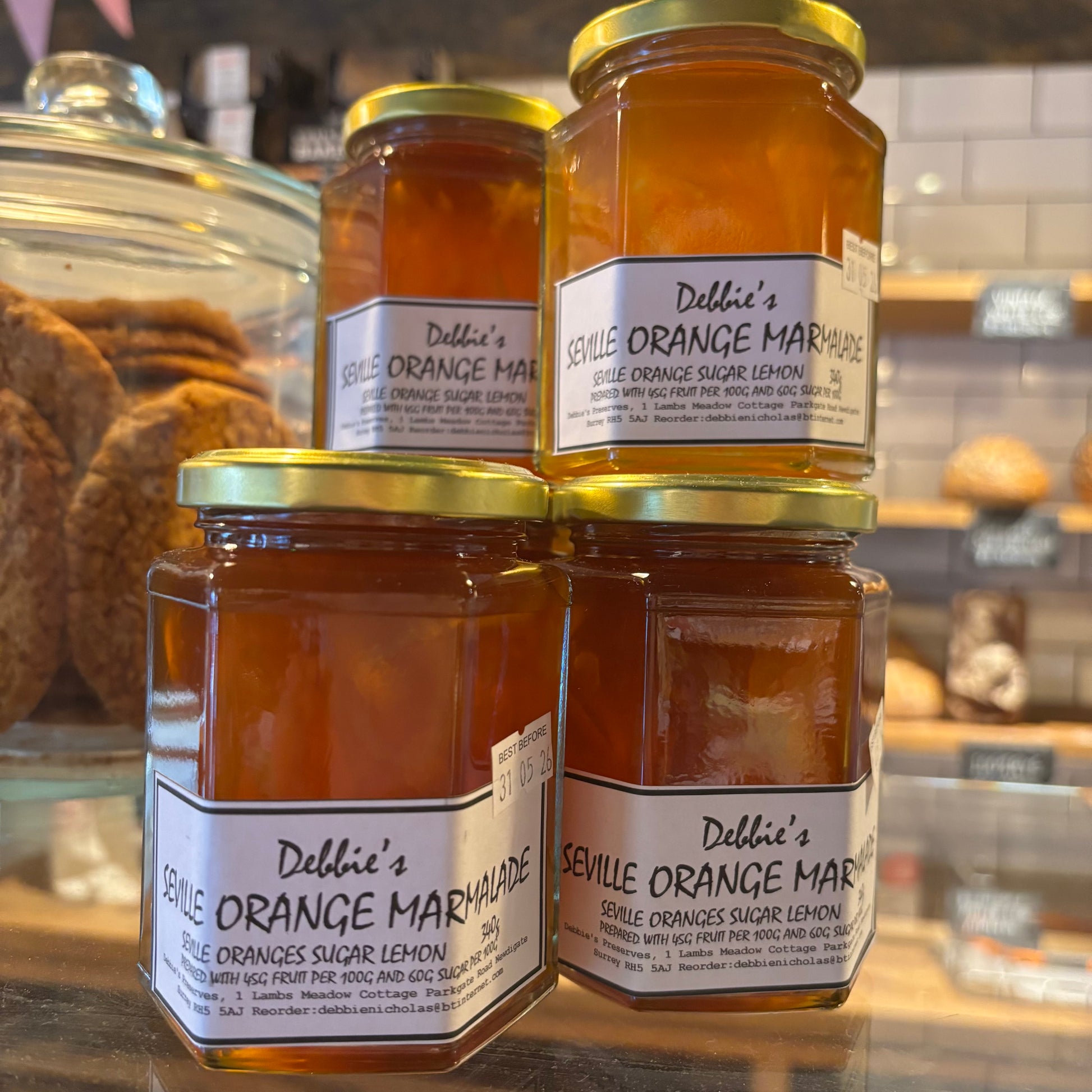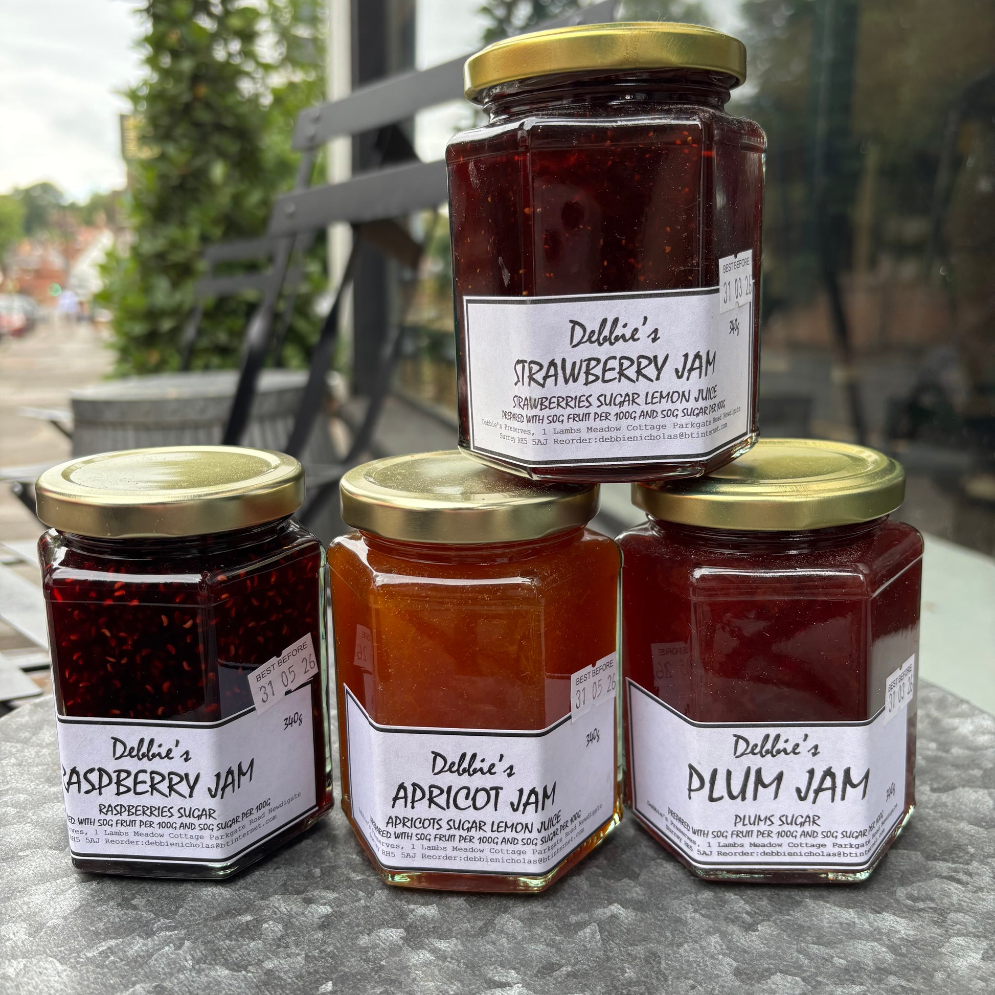 Debbie's Homemade Preserves is a small home-run business in Newdigate near Dorking in Surrey. There are no artificial colourings, preservatives or flavourings in the preserves. Jams and marmalades made using home-grown and local fruit and vegetables. 340g.