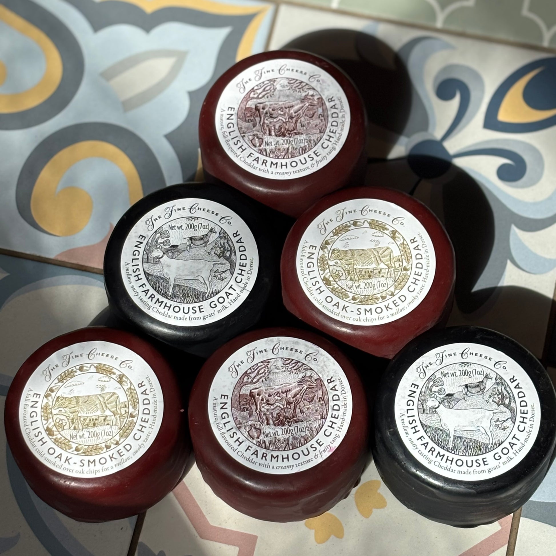 Sweet and tangy Cheddar cheese with a particularly creamy texture and an occasional crystal caused by long maturing. The oak-smoked Cheddar is cold-smoked over real oak chips to give a natural, delicate smoky flavour with no harsh notes. The hand-made goat's Cheddar is less powerful in flavour, mellow and nutty, with a delicate, subtle sweetness. These authentic, West Country Farmhouse Cheddars are made in Dorset, using the traditional method of stacking the curds by hand. 200g.