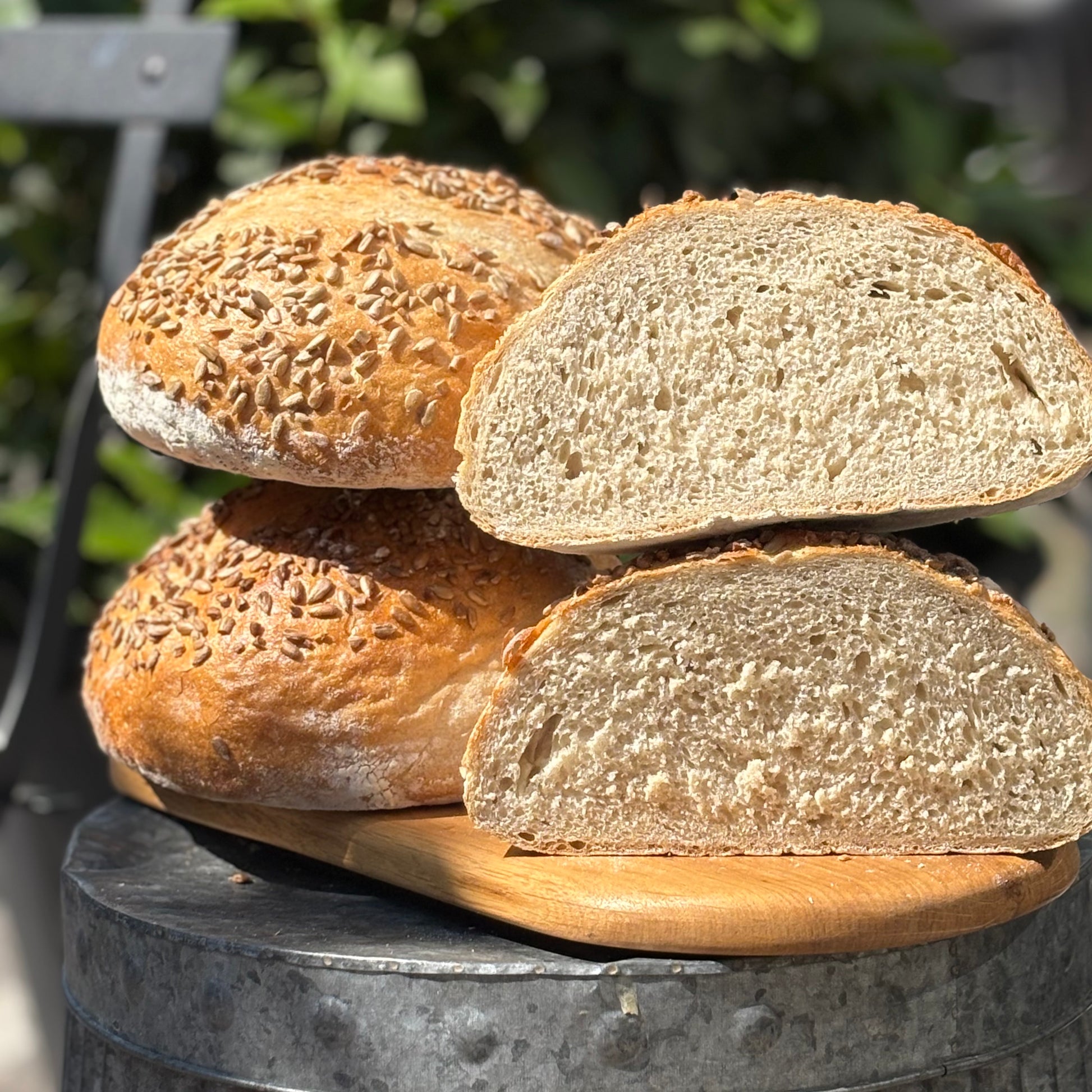 Made from a combination a white flour and our rye sourdough starter. 650g.