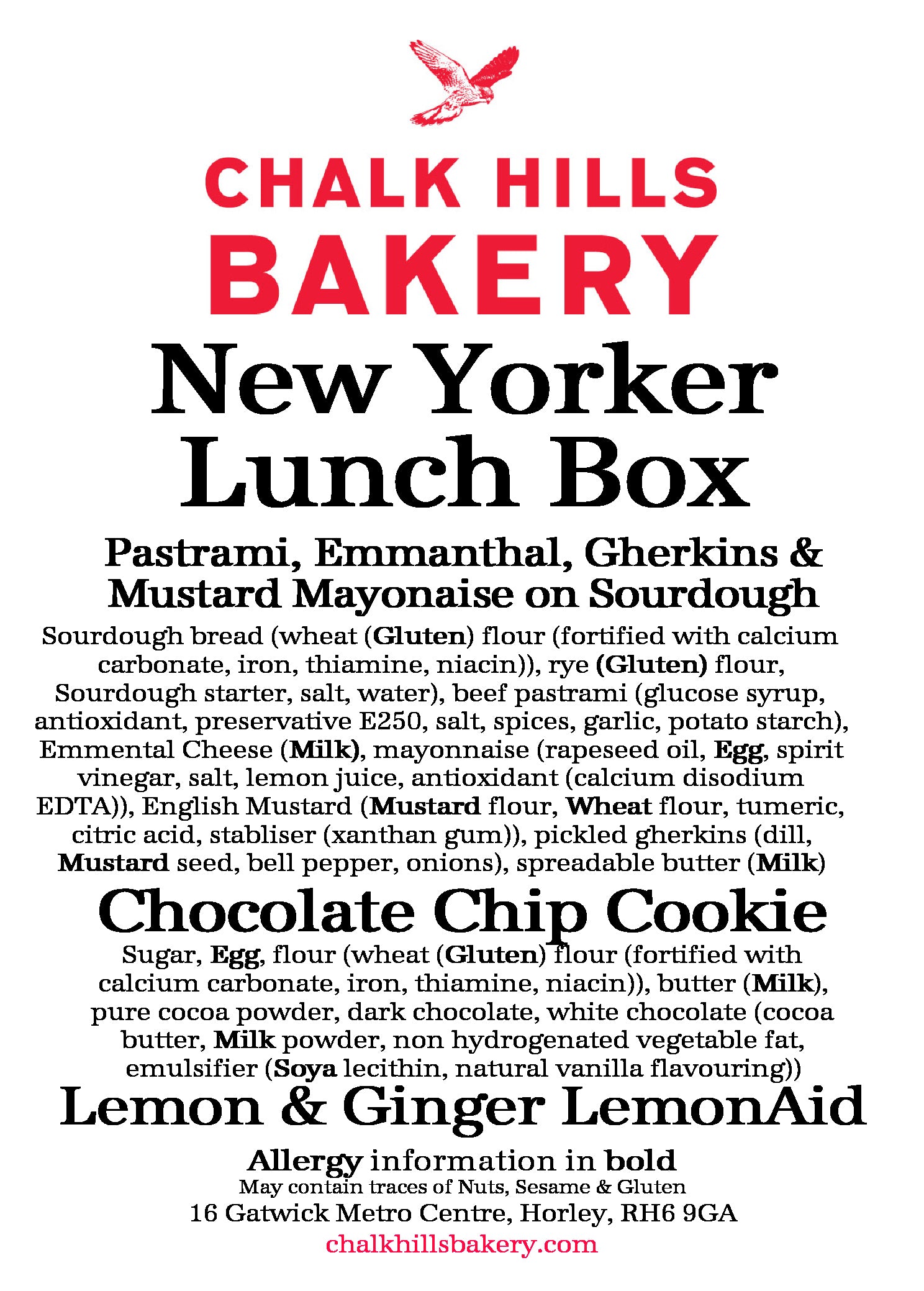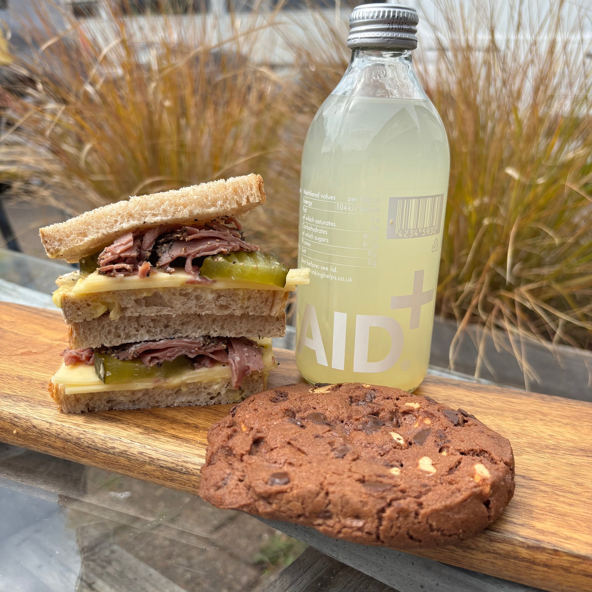 Lunch box with a New Yorker sandwich (pastrami, emmental cheese, pickled gherkins, mustard mayo on Sourdough), lemon & ginger LemonAid and a chocolate chip cookie.