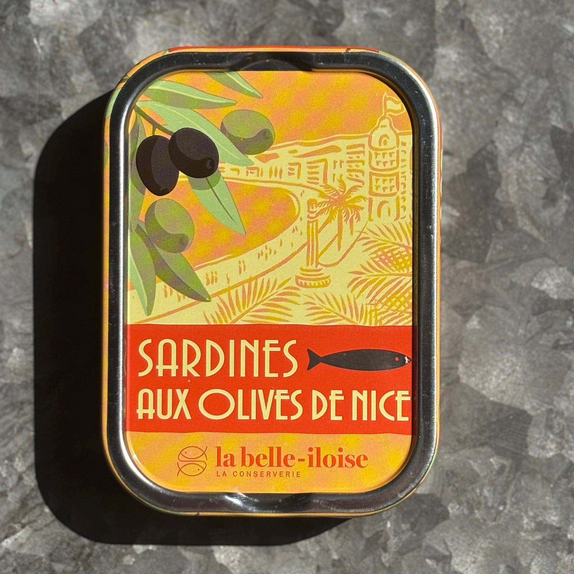 Whole olives from Nice (with their pits) bring beautiful colours and round taste to these tender sardines. They combine with the delicate fruitiness of the extra virgin olive oil and enhance the sardines’ subtle and refined flavours. 115g.