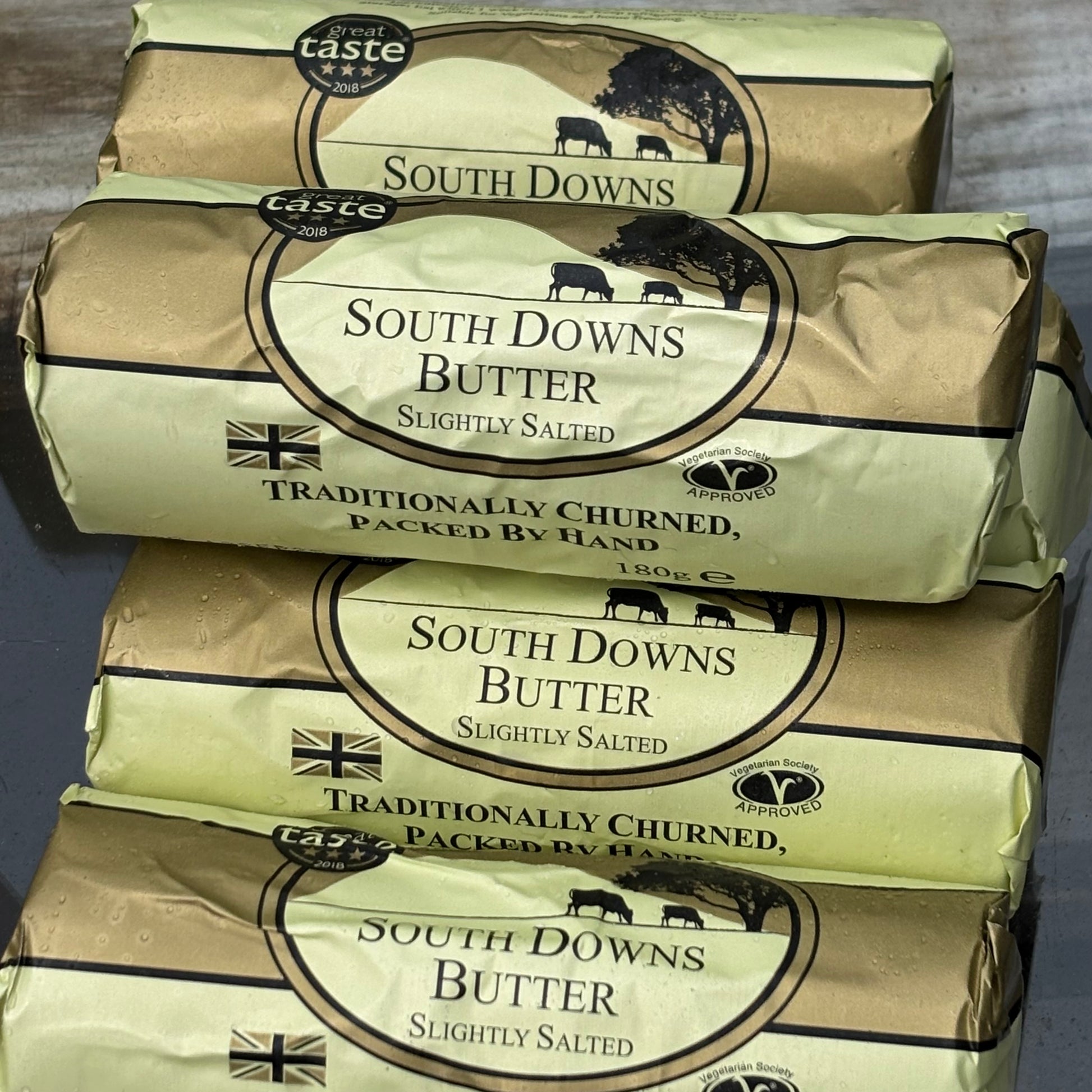 Step back in time with South Downs butter: made with cream that is specially aged for three days. This traditionally churned butter is washed with ice cold water before it is extruded and packed by hand. 180g.