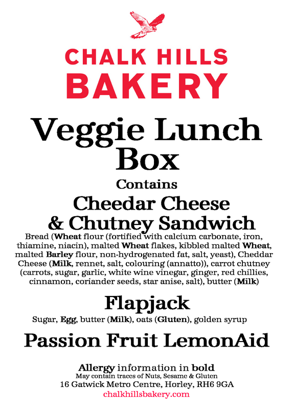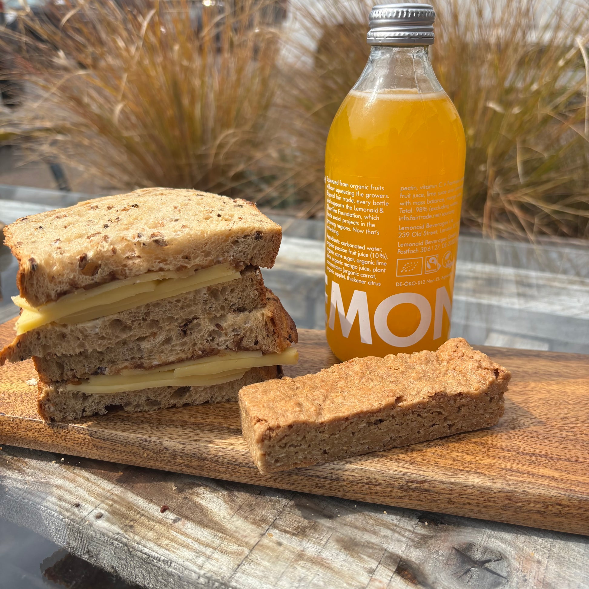 Lunch box with cheese & chutney sandwich (cheddar cheese and homemade carrot chutney on granary), passion fruit Lemonaid and a flapjack