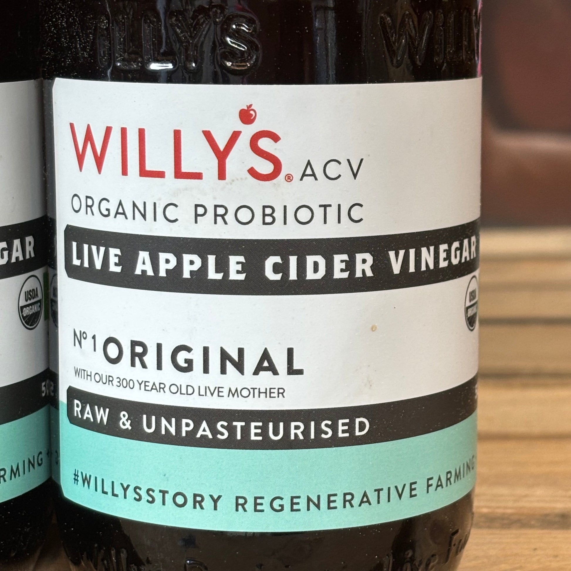 Raw and unpasteurised, made from live mother starter. Willy's original Apple Cider Vinegar containing live mother is grown and produced at the source in Herefordshire, using a blend of 48 wild apple varieties from their 300-year-old orchard. Delicious in cooking or added to drinks. Always shake the bottle to ‘wake the mother’! 500ml.